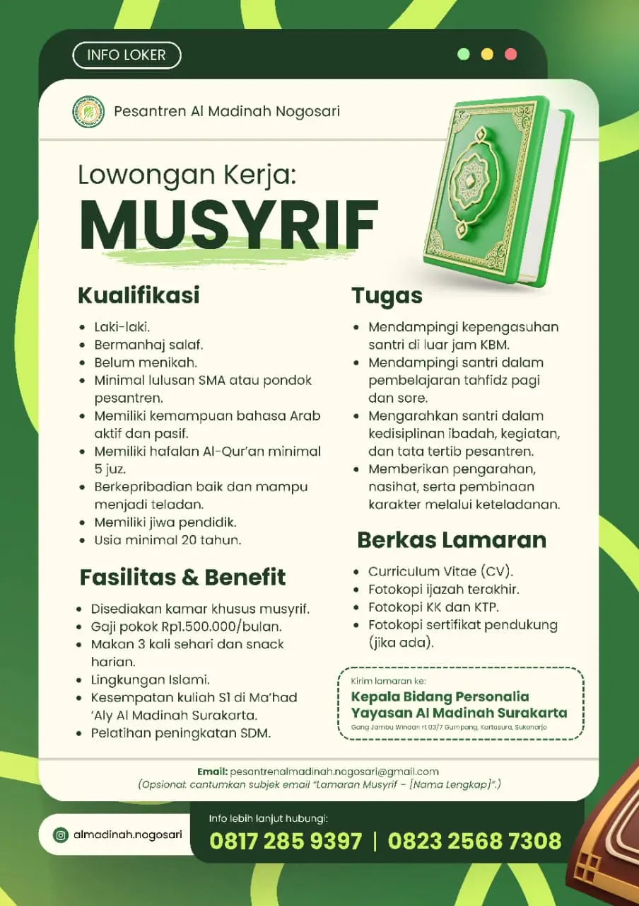 Poster lowongan Musyrif Pesantren Al Madinah Nogosari Boyolali tahun 2025